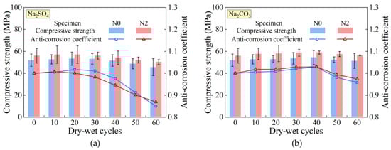 In Figure 10a, for the anticorrosion coefficient, the peak of N0 occurs later than that of N2 in the Na2SO4 solution. The reason may be that N0 has more voids than N2. The voids in N0 would take more dry–wet cycles to be filled with the reaction products and crystals. After 40 cycles, the anticorrosion coefficient of N2 falls slower than that of N0 in the Na2SO4 solution. This is because N2 has a higher matrix strength than N0, contributing to resisting the internal expansive stress and the crystallization pressure. Thus, NS can improve the corrosion resistance of the concrete to sulfates in the late stage of the dry–wet cycle. In Figure 10b, the anticorrosion coefficient of N2 is higher than that of N0 in the Na2CO3 solution. During cycles 40 to 60, the anticorrosion coefficient decreases by 6.86% and 5.35% in N0 and N2, respectively. This shows that N2 has a stronger corrosion resistance than N0 in the Na2CO3 solution, especially in the late dry–wet cycles. Consequently, NS can enhance the corrosion resistance of CFAA concrete to carbonates.