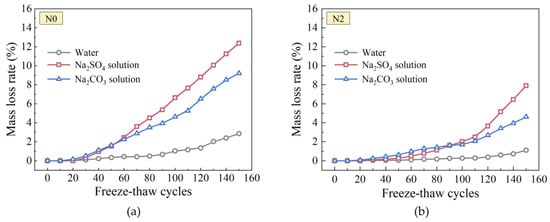 Mass loss rate of the specimens under freeze–thaw cycles: (a) N0; (b) N2.