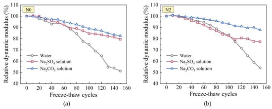 Relative dynamic modulus of the specimens under freeze–thaw cycles: (a) N0; (b) N2.