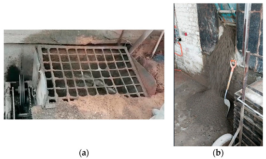 - Mixing: A motorized blade mixer was used for mixing (Figure 2a,b). The coarse aggregates (gravel and CDW) were added first, followed by fine aggregates (silt and tire flakes); then, the cement was added, and they were dry-mixed until a homogeneous mixture was achieved. Then, the water was incorporated in partial quantities until reaching the total for each mixture and achieving again a homogeneous mixture.