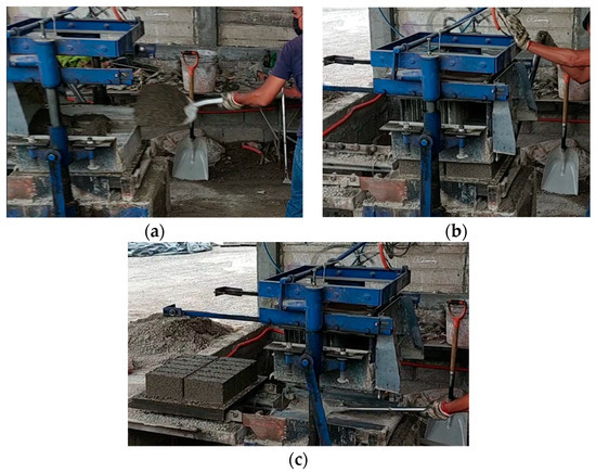Figure 3. Filling and compacting molds: (a) mold filling, (b) vibro-compacting, and (c) demolding and specimen removal.