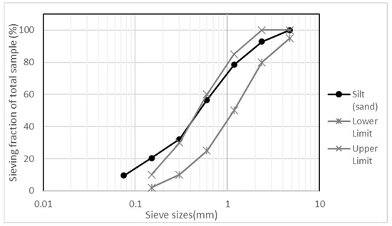 In the case of the granulometry of fine aggregate (silt), an excess of fine particles can be observed (Figure 4) compared with the permissible limits for the production of concrete. This excess of fine aggregates impacts the fineness module close to 2.0 (Table 3) so that the silt used can be classified as fine sand.