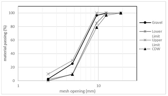 The granulometry studies of the coarse gravel and the CDW aggregates (Figure 5) show that gravel is within the permissible limits for concrete, so this aggregate would have little impact on the mechanical performance of the samples, and the arrangement of its particles during the elaboration of the partitions is adequate. The opposite occurs with CDW materials, since they have excess coarse particles, although this is not significant.