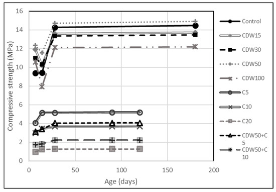 The incorporation of CDW shows a slight improvement in the compressive strength of the mixture that incorporates 50% of them (Figure 6), as the only mixture that managed to overcome the control in all test ages. For this reason, we decided to combine 50% of the RCD with tire flakes, although again extremely unfavorable results were obtained.
