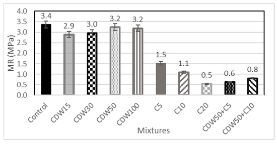 The static bending (MR) tests were performed when the specimens were 28 days old since this is the age at which 100% of the design strength of the mixtures is reached; this is also the value considered for structural and constructive calculations in civil works. The results of this test (Figure 7) again show that the incorporation of CDW by 50% manages to maintain a flexural strength very similar to that of the control, with a difference of only 5.9%. Another mixture that presents similar results is that which incorporates 100% CDW, which reaffirms the fact that CDW can be a substitute for natural stone materials in high percentages.