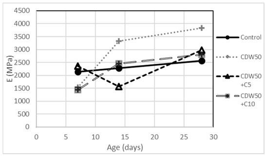 In the case of mixtures incorporating both residues, there is a drop in stiffness with respect to the mixture with 50% CDW, and this may be due to the presence of tire flakes as already observed in the previous tests, although in this case, the decrease in stiffness slightly exceeds the control at 28 days. This could imply improvements in the dynamic behavior of the mixtures; since they do not present the same resistance as the control, but the same modulus of elasticity, it could be inferred that other properties related to stiffness could be improved, such as impact resistance [49] and resilient modulus [50].