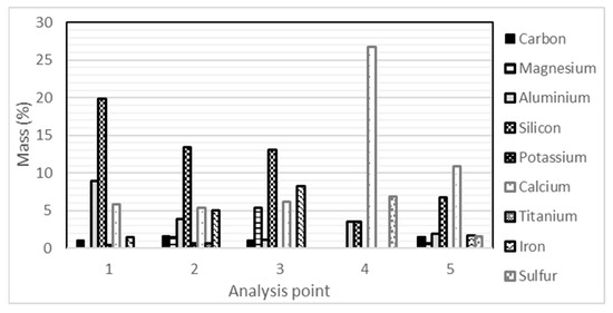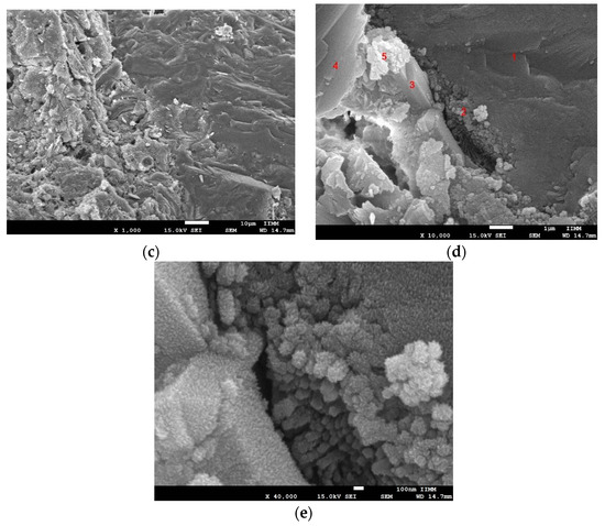 This analysis focused on the interface between the CDW aggregate and the new cementitious matrix formed with Portland cement. In Figure 9a, we can observe a difference in the morphology of the surface. The union between the new cementitious matrix and CDW is observed; the CDW shows greater porosity and the presence of more pronounced irregularities (Figure 9b) than the new cementitious matrix, where a more compact surface with less presence of pores can be observed. Figure 9c more clearly shows the difference in the surface morphology of the two materials; the CDW material shows a more compact surface with small variations in height, always showing it as a whole. On the other hand, the surface of the new matrix shows changes in morphology with a variety of shapes and heights and the presence of gaps or separations between the parts that constitute it. Figure 9d shows a difference in the tonality of the surfaces, in addition to the presence of crystalline morphologies in the new cementitious matrix. The union between the two materials is clearly appreciated, as is how the new material forms the bond—by means of small agglomerations on the CDW material. Figure 9e shows a closer view with 40,000× magnification; the gap union of CDW and the new cementitious matrix can be seen. As for the differences in morphology, the CDW shows the agglomeration of prism particles with small sizes, producing a rougher surface, unlike the surface of the new cementitious matrix, which shows a smoother surface with larger particles. In this image (Figure 9c), the sampling points for the EDS analysis are labeled; the values of the % of mass are shown in the graph of Figure 10. A greater presence of silica and aluminum can also be observed in the CDW sample; this may be due to the fact that the CDW was derived from structural concrete, in which elaboration and curing processes were carried out according to standard regulations, while the samples taken from the new cementitious matrix show the presence of a higher percentage of calcium and sulfides, which may be due to a poor curing process, since the samples, once elaborated, were left to dry for the standard time. In the case of analysis point 4, a high calcium content is observed, which is due to the fact that it is a portlandite crystal given the morphology of the crystal; since it is a byproduct of the hydration of Portland cement, its dicalcium and tricalcium silicate phases are belite and alite. The composition matches the morphology.