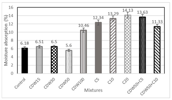 Figure 11 shows the results of this test. It can be seen how the mixtures with the highest recorded absorption correspond to those that incorporate tire flakes. The lowest percentages of absorption correspond to the mixtures that incorporate CDW, with the 50% CDW mixture being the one that presents the lowest result (in fact, lower than that of the control mixture).