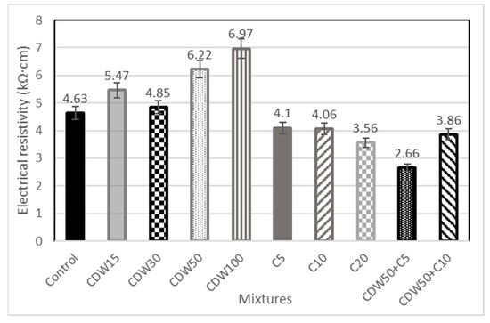The electrical resistivity was determined using the direct method and the same specimens with which the static module of elasticity was determined at 28 days. The test was executed following the ASTM C1876 [47] standard and the DURAR network manual [51], as seen in Figure 12. In the case of the electrical resistivity test (Figure 12), it is observed that the lowest results correspond to mixtures with tire flakes, which is consistent with the absorption results (Figure 11), since the higher the absorption, the greater the presence of pores and therefore the lower the electrical resistivity. Similarly, the lowest performances correspond to the mixtures that incorporate CDW and tire flakes; the 50% and 100% mixtures present the highest results. Comparing this test with the results of absorption, the mixture with 100% CDW exhibits a strangely high level of electrical resistivity, not in agreement with its percentage of moisture absorption. Figure 9 shows the microstructure of the interface between a CDW aggregate and the new Portland cement matrix. In this figure, the high porosity of the CDW can be seen (Figure 9a,b), so in the specimens in which 100% of the CDW is replaced with gravel, there is a significant effect of this porosity. As the ER test is very sensitive to the moisture content of the sample, this strange behavior may be due to the rapid drying of the samples composed of 100% CDW and therefore could impact the obtained results.