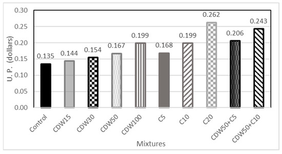 Figure 13 shows the first comparison of the unit costs of the blocks analyzed with different additions and combinations of tire and CDW. It can be seen that CDW achieves a slight improvement in the unit cost of the block, while the tire flakes significantly increase this cost, even in combination with CDW. Evidently, the greater the replacement of CDW with natural aggregate in the mixture, the greater the reduction in the unit cost of the partition; therefore, the mixture with the lowest unit cost is the one that incorporates 100% CDW.