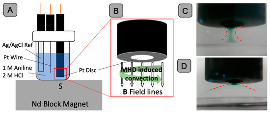 (A) Schematic of experimental setup for a magnetic field oriented perpendicular to the surface of the Pt disc working electrode; (B) Schematic of magnetic field lines and MHD at the working electrode surface; (C) Image of electrode surface during polymerization under no magnetic field, in which the polyaniline can be seen to drift down off the electrode surface in a column due to gravity; (D) Image of electrode surface during polymerization under 530 mT, in which the MHD effect creates a cone around which the polyaniline rotates as it drifts away from the electrode surface.