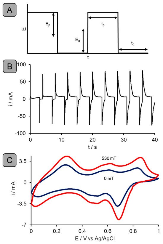 (A) General applied potential waveform; (B) i vs. t curve of pulsed-potential polymerization; (C) an example of a comparison of two characterization CVs.