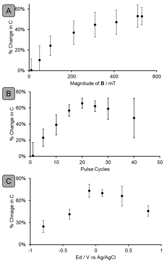 (A) The effect of the magnet at various magnetic field strengths versus the control. The electrode was modified with a pulse of 1.1 V for 3 s and a downtime of −0.1 V for 1 s for 10 cycles in 1 M aniline and 2 M HCl. (B) The effect of a 530 mT magnetic field on the resulting capacitance of the polymer versus the control when running the polymerization for different lengths of time. The electrode was modified with a pulse of 1.1 V for 3 s and a downtime of −0.1 V for 1 s in 1 M aniline and 2 M HCl. (C) The effect of 530 mT on the capacitance of the polymer versus the control at various downtime potentials. The electrode was modified with a pulse of 1.1 V for 3 s and a downtime of 1 s for 20 cycles in 1 M aniline and 2 M HCl.