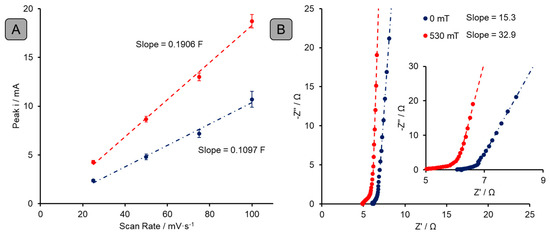 The optimized procedure (a pulsed-potential deposition with a pulse of 1.1 V for 3 s and a downtime of −0.1 V for 1 s, running for 20 cycles, and applying a magnetic field of 530 mT) was characterized via CV and EIS in sulfuric acid. A series of CVs were performed at varying scan rates on electrodes modified with and without the presence of a magnetic field. As shown in Figure 5A, the slope of the peak current as a function of the scan rate represents the capacitance of the electrode. It is shown that the application of a magnetic field increased the capacitance of the modified electrodes by 74%. For further characterization, EIS was performed on the electrodes at the open circuit potential (Figure 5B). It is shown that for the electrodes modified in the presence of a magnetic field, the slope of the Warburg diffusion line was significantly increased, which also indicates improved capacitance, as the slope of the Warburg diffusion line tends to infinity for pure capacitors [58].
