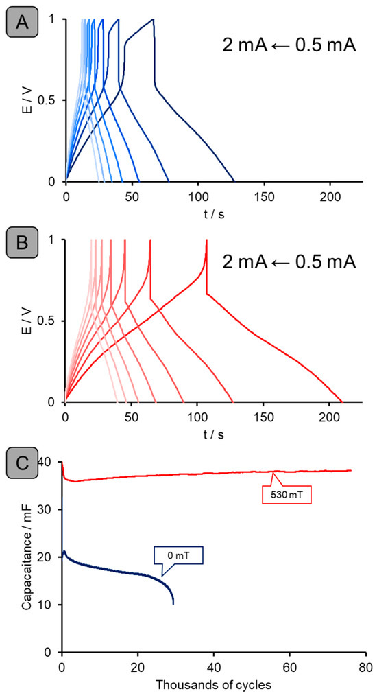 Galvanostatic charge/discharge (GCD) is an ideal approach for investigating the electrochemical capacitance of materials. GCD was performed on symmetric capacitor configurations composed of PANI films synthesized in the absence (Figure 6A) and the presence (Figure 6B) of 530 mT magnetic fields. The cells were constructed by placing two platinum electrodes, both modified either with or without a magnetic field, into a 1 M H2SO4 solution to simulate the behavior of a symmetric supercapacitor. The cells were charged and discharged at currents ranging from 0.5 to 2 mA. The longer discharge times of the cells composed of PANI synthesized in a magnetic field at the same applied currents confirms their improved capacitance.