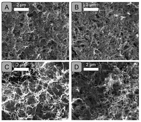 To investigate the cause of the improvement, the morphology of the polymers formed with and without the presence of a magnetic field were investigated via scanning electron microscopy. To perform the analysis conductive, adhesive carbon tabs were affixed to the working electrode surface, and the PANI was deposited on the carbon. The carbon tabs were then transferred to SEM stubs for imaging. The PANI films exhibited an intertangled fibrous structure. The bulk of both PANI films were similar in fiber density and thickness (as shown in Figure 7A,B), however, the edge sites show different morphologies. At some edge sites, significantly thinner fibers were observed on the PANI film synthesized in the presence of a 530 mT magnetic field. These thin fibrous structures were both more common and more pronounced in the polymer formed under 530 mT, suggesting that not only does forced convection, driven by the MHD effect, result in a larger PANI yield, but that the thickness of the PANI fibers can be influenced by these conditions.