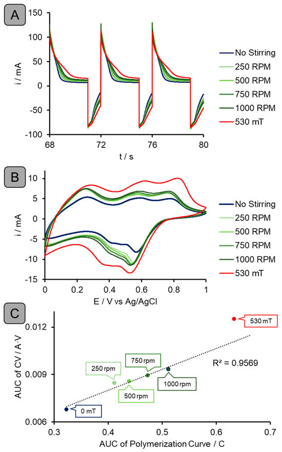 (A) The current response of the final three pulses of polymerization when stirring at various rates versus the control and when polymerizing in the presence of a magnetic field. (B) CVs in 1 M H2SO4 of the electrodes modified in (A). (C) The areas inside the characterization CVs in (B) plotted against the areas under the full polymerization curves in (A).