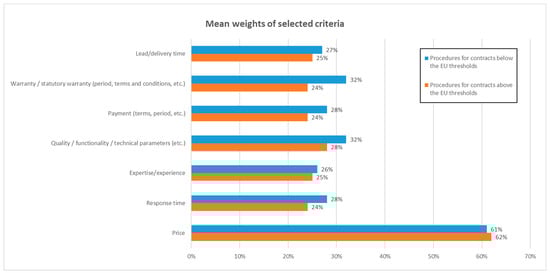 Other employed criteria were related to the subject matter’s quality, functionality, or technical parameters. In the case of the procedures valued below the EU thresholds, the criteria were adopted for 10%. In the case of the procedures above the thresholds, it was 18%.