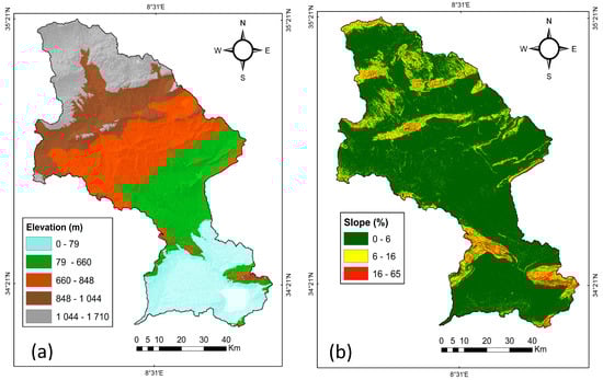 The areas exhibiting the highest risks are represented by lowlands with a slope less than 6% and riverbeds, while the steepest slope refers to the areas less prone to flood risks (Figure 3b).