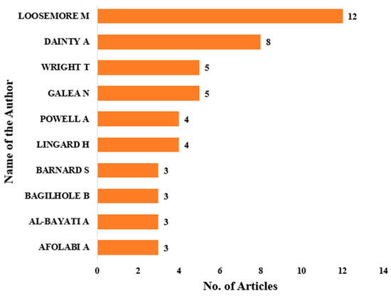 A total of 459 authors participated in the creation of 197 papers in the area of workforce diversity. The top 10 contributors to the research field are shown in Figure 3. Martin Loosemore was the most prolific author, with twelve publications, followed by Andrew Dainty with eight. Natalie Galea and Tessa Wright each had five publications in this field. These authors have made significant contributions to the field through their studies on topics such as culture, gender, identity, and equality. Their research sheds light on the challenges and opportunities faced by women and other minority groups in the industry.