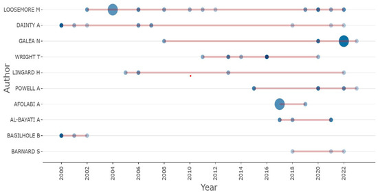 The authors’ production over time of the top ten authors is shown in Figure 4. The node’s size indicates the number of articles, while the node’s colour signifies the cumulative citations those articles have received.
