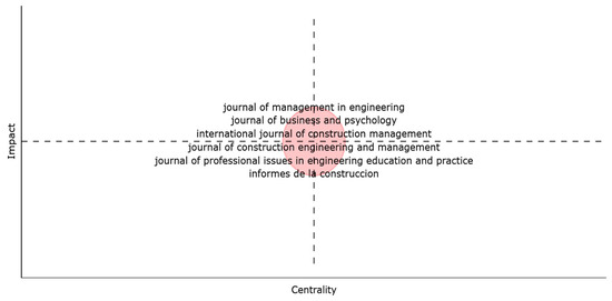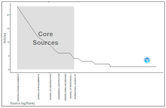 This study applied Bradford’s law of scattering to identify the core sources of the literature on workforce diversity in CS. This bibliometric method describes how journal articles are distributed across different sources in a given research field [53]. Bradford’s law divides the sources into several zones based on the number of articles they contain. This study classified the sources into three zones: Zone I, which consisted of seven sources with 66 articles; Zone II, which consisted of 43 sources with 66 articles; and Zone III, which consisted of 65 sources with 65 articles. Figure 5 shows the seven core sources in Zone I, which are Construction Management and Economics, Journal of Management in Engineering, Journal of Construction Engineering and Management, Engineering, Construction and Architectural Management, Gender, Work and Organization, Journal of Professional Issues in Engineering Education and Practice, and International Journal of Construction Management. These sources represent the most influential and relevant outlets for publishing research on workforce diversity in CS.