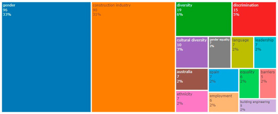 This study used frequency to measure word occurrence to identify the most frequently used keywords in the literature on workforce diversity in CS. Figure 6 shows a treemap that illustrates the relative frequency of the top fifteen keywords. The analysis showed that the terms ‘gender’ and ‘construction industry’ were the most common keywords, appearing 96 and 90 times, respectively. The other frequent keywords were diversity, discrimination, cultural diversity, ethnicity, gender equality, and language. These keywords indicate that the research on workforce diversity in the CS has mainly addressed the issues of gender, race/ethnicity, and culture. This is likely because these dimensions of diversity are particularly relevant to the CS workforce, which is predominantly male and white.