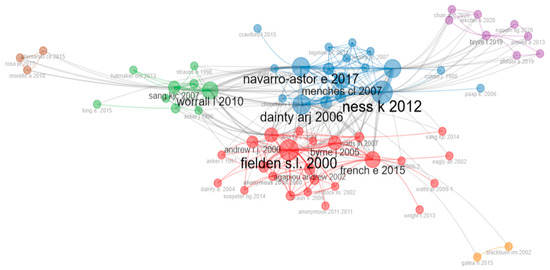 When two publications are cited together in an article, it is known as co-citation [56]. When two publications are often co-cited by other papers, these two references likely share some common information [57]. The co-citation network of the documents is visualized in Figure 8. The nodes in the network represent publications, and were labelled with the initial author and publication year. Edges between nodes represent co-citation relationships, and the thickness of an edge symbolizes the strength of the co-citation relationship. The size of a node represents the number of local citations received by the publication. The node’s colour identifies the cluster that the document belongs to. The figure consists of six clusters and the first cluster is represented by a red colour. This is the largest cluster with 24 documents. The top three most cited articles in this cluster include French and Strachan (2015) [58], Dainty et al. (2000) [44], and Fielden et al. (2000) [59]. The second largest cluster is blue, with eighteen documents. Ness (2012) [46], Dainty and Lingard (2006) [49], and Navarro-Astor et al. (2017) [60] were the three most cited documents in this cluster. Similarly, Worrall et al. (2010) [61] in the third cluster, Bryce et al. (2019) [62] in the fourth cluster, Blackburn et al. (2002) [63] in the fifth cluster, and Morello et al. (2018) [27] in the sixth cluster were the other most cited references.