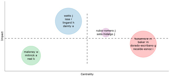 Clustering by coupling represents a bibliometric approach that arranges authors or sources based on their shared references, uncovering patterns and associations in a body of academic literature [64]. This technique provides valuable insights into the interconnectedness and influence of authors or sources in a particular field. As depicted in Figure 9, the analysis employed bibliometric coupling based on sources with common references. The results identified a unique cluster composed of six sources with shared references, indicating a robust thematic link among these sources. These sources, with a centrality value of approximately 16.67, are highly interconnected within this cluster, suggesting their central role in the discourse of this specific field or topic. Moreover, an impact value of around 1.50 implies these sources have a substantial influence on the network, potentially steering the research direction and focus in this area.
