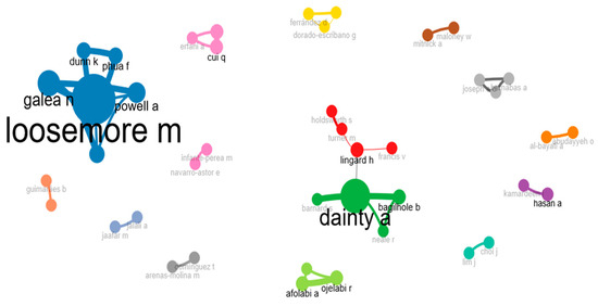 A collaboration network is a bibliometric network used to analyse the relationships between authors, institutions, or groups based on their collaborations. A collaboration network map can be created in a bibliometric analysis to visually display the connections and collaborations between different entities in a specific field [33]. Figure 11 depicts the collaboration network of authors with fifteen distinct clusters. The most substantial cluster comprises six authors, while eight clusters are made up of only two authors each. Notable scholars who have collaborated with more than two authors include Martin Loosemore from the University of Technology, Andrew Dainty from Loughborough University, and Helen Lingard from RMIT University.