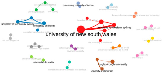 Figure 12 illustrates the sixteen clusters showing the collaboration network among the participating institutions. Notable collaborators with more than two institutions include the University of Reading, Queensland University of Technology, University of New South Wales, University of Western Sydney, and the University of Lincoln. Moreover, a thicker edge between the University of New South Wales and the University of Western Sydney signifies more joint publications, indicating a strong collaborative relationship.