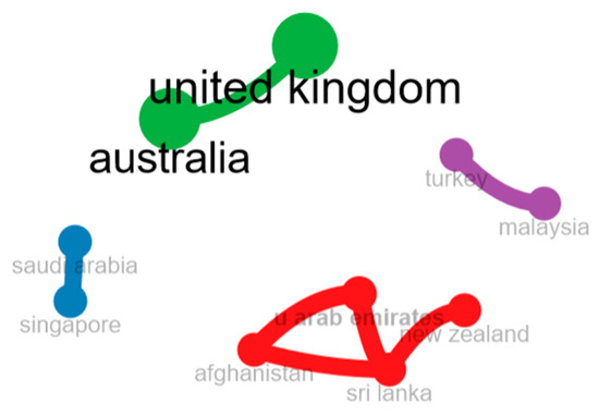 Figure 13 shows the collaboration network among countries with four distinct clusters. The first cluster illustrates the collaborative relationships between Sri Lanka, the United Arabic Emirates, New Zealand, and Afghanistan. The second cluster includes Singapore and Saudi Arabia, while the third comprises the UK and Australia. The fourth cluster is made up of Turkey and Malaysia. Additionally, the network reveals a robust collaborative partnership between the UK and Australia.
