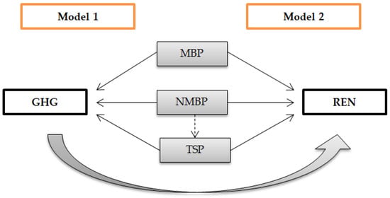 where lnGHG represents the natural logarithm of total greenhouse gas emissions, REN is the share of renewable energy consumption in total energy consumption, MBP is the market-based policies sub-index, NMBP is the non-market-based policies sub-index, TSP represents the Technology Support Policies sub-index, i is the country, t is time, β is the coefficient associated with the variables, and ε is the error term.
