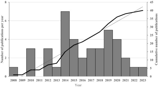 A total of 40 papers published between 2008 and 2023 were identified, as shown in Table S1. Figure 1 represents the distribution of papers by year of publication, showing that the cumulative number of research papers is well fitted by a linear function and indicating constant interest in this area. Nearly half of the studies examined (n = 19) were used to frame the first section, which was dedicated to clarifying whether and how green perceived value influences consumers’ behavior or judgments. The remaining 21 papers represented the second section, which was dedicated to analyzing some of the major factors affecting motivation for green consumption behavior; these studies were mainly divided into those examining dispositional factors (n = 9) and contextual factors (n = 12).