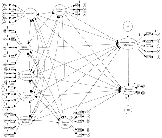 For analysis, we used the statistic software program AMOS 5.0. First, all of the 50 items were included in the analysis to form a scale of TQM practices, financial, performance, and operational performance. We referred to Cronbach’s alpha to ensure the reliability of variables. As a result of the analysis, the Cronbach’s alpha value was high at 0.925. Second, we looked at the corrected inter-item correlation. It was found that the resulting values were 0.500 and above, except for one item (0.418), CF5 (“Managers and supervisors encourage patient satisfaction development activities”). According to these findings, variable CF5 was removed from the scale.