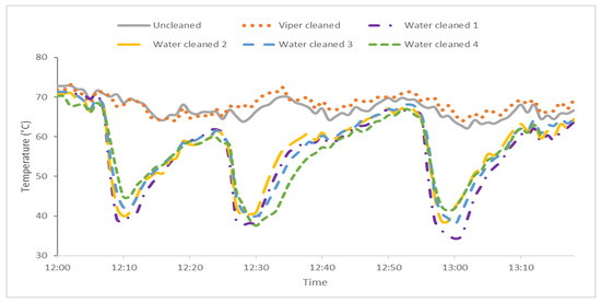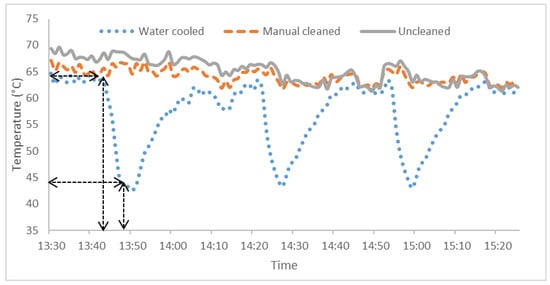 Temperature of uncleaned, wiper-cleaned, and water-cleaned PV panels for the first configuration as a function of peak daytime. The dash line arrows indicate the highest and lowest temperature drops with respect to time.