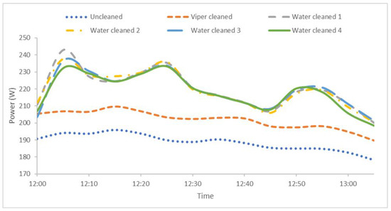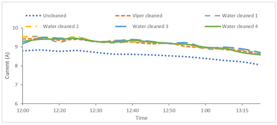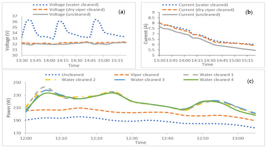 The short-circuit current, open-circuit voltage, and power produced for water-cleaned, wiper-cleaned, and uncleaned PV panels in the second configuration are shown in Figure 6, Figure 7 and Figure 8, respectively. Before flushing water, the voltages and currents for all these panels were almost the same, with minimal difference. After flushing water, the water cooled and cleaned the panel and maintained a consistently higher voltage with a peak difference of 3.7 V and 3.3 V compared to the uncleaned and wiper-cleaned panels, respectively (see Figure 7). The current in wiper-cleaned PV panels also improved by 6.5% when compared to the uncleaned panel, as indicated in Figure 6. The water-cleaned panels produced, on average, 8% more power than the dry-cleaned panels and 14% more power compared to the uncleaned panels (refer to Figure 8).