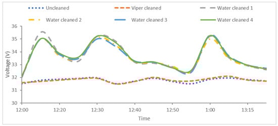 On the other hand, Figure 4b shows that both the reference dusty panel and dry clean panel produced a consistently lower voltage compared to water-cleaned panels, with a peak difference of 4.4 V. Since the voltage is a direct function of panel temperature, it can be concluded that, besides cleaning, the condensate water layer significantly cooled the panel.