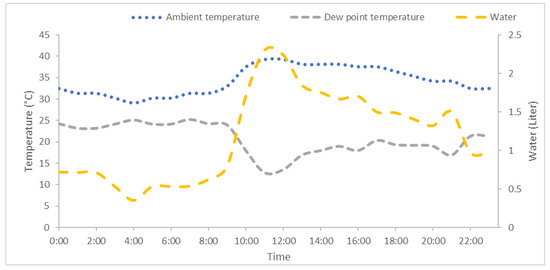 The results indicate that the peak water generation of 2.24 L occurred at noontime (12:00 p.m.), when the ambient temperature was at its highest and the dewpoint temperature was at its lowest. If the system operates continuously throughout the day, it is projected to produce approximately 30 L of water.