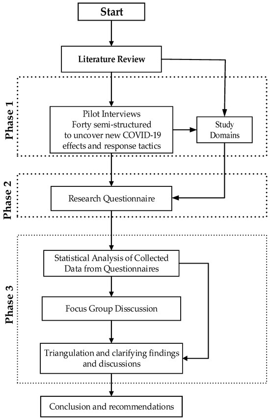 In order to obtain a solid response from the SCI on the main effects of the COVID-19 pandemic and to evaluate measures taken by the industry to mitigate the negative impacts on the performance of firms operating in this sector, this research followed the principles of a mixed-research methods approach. This method comprises collecting quantitative and qualitative data simultaneously or sequentially in a single study and integrating the data at one or more stages of the research process [25,26]. The combination of quantitative and qualitative approaches, which has gained popularity, provides an expanded understanding of research problems [25,27]. Our research efforts went through three phases as illustrated in Figure 1, the research methodology framework. This approach will give a broader understanding of the research subject and will answer the research exploratory questions of “how” and “to what extent”.