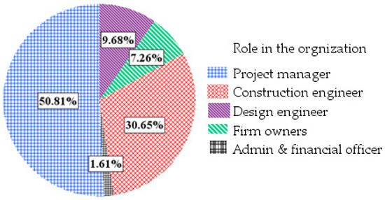 Figure 3 shows the role and position of the respondents in the firms, where project managers represent 50.81% of the whole population; 30.65% construction engineers; 7.2% firm owners; 9.68% design engineers; and 1.61% administrative and financial officers. As stated earlier, the survey mainly targeted project managers and construction engineers, who comprised around 82% of the total respondents.