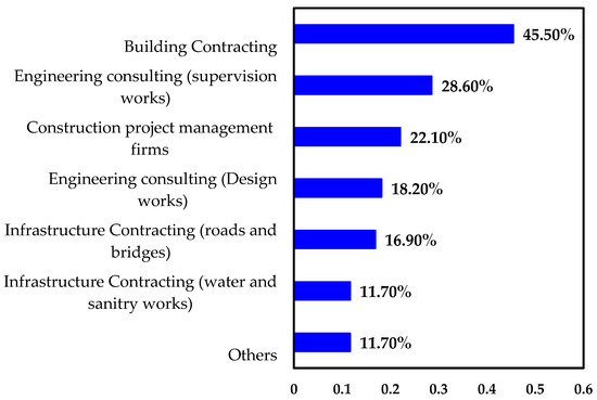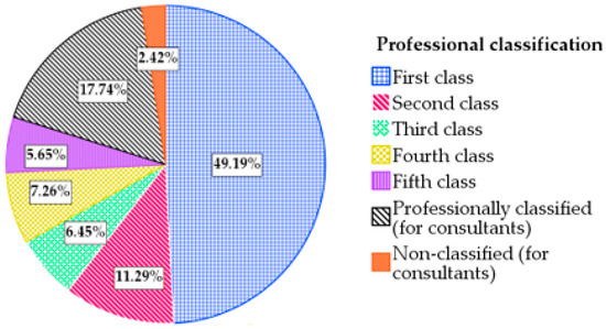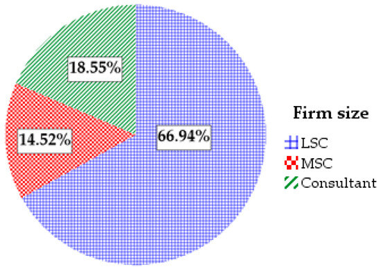 The organization’s classification and size play a key role and are regularly pertinent to the capacity of contracts and complexity of projects that a company may simultaneously initiate. To assure contractors’ capabilities and performance, the Saudi government uses the low-bid delivery method and the contractor’s classification system as the foundation of the primary qualities contractors must possess for the vast majority of public contract work. Current grading criteria include seven categories and five levels. To determine a contractor’s categorization in a certain industry, classification grades are used. Through grades 1 through 5, the contractor will be restricted to a certain maximum financial value for a project, and he will be permitted to complete the project in his particular field. The contractor is not required to have a grade if the project does not exceed its upper limit [19,24,25]. As presented in Figure 5, the response to the questionnaire survey shows that 50% of the respondents fall within the first class. The consulting firms that responded to the questionnaire made up 20.16% of the total respondents, whereas 17.74% were classified and 2.42% were not. For the purpose of the analysis in this research, a sub-classification into large and medium size contractors, and consultants was adopted. Large size contractors (LSC) have a number of employees that is 500 or more, medium size contractors (MSC) have a number of employees that ranges from 50 to 500, and the consultants are as shown in Figure 6.
