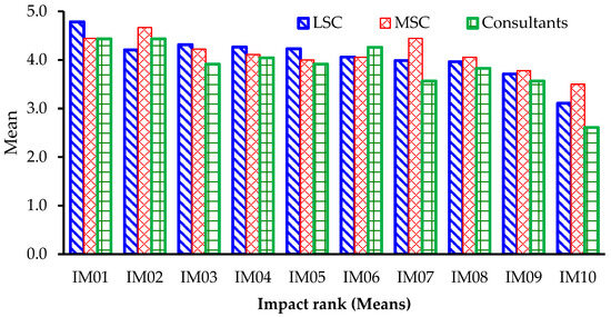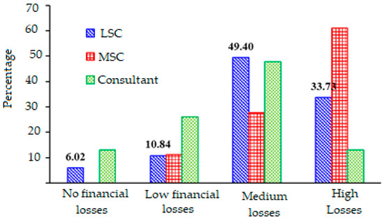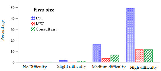 The financial performance of the construction firms was ranked relatively low (mean = 3.07). The main factors contributing to the negative consequences of financial performance were identified as follows: increased project costs, inflation rate, exaggerated cost of raw materials, disrupted cash flows, suspension or termination of funding, bankruptcy, and employees getting paid without work. Figure 13 shows clearly that MSC were affected more than LSC. This is because most contracts and construction activity for medium-sized contractors originated from the private sector, which was severely impacted in terms of financing by COVID-19. According to the focus group participants, both experienced and unskilled construction workers are seeing their earnings decrease, especially in the private sector. Because of significant capital outlays, cost flexibility, and intense rivalry, the construction industry is often susceptible to fluctuations in the economy, and this is particularly true during recessions [31,38,48,49]. In point of fact, these shifts rely on both internal and external causes (such as political instability and crises), which may lead to an increase in the likelihood of undesirable financial outcomes [48].