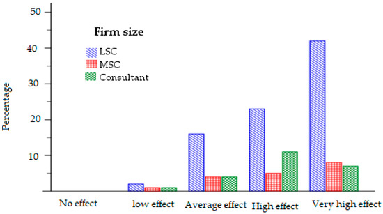 Results from the questionnaire revealed that the level of impact had the same tendency in the groups of LSC, and MSC, as shown in Figure 9. The most obvious impacts are the total stoppage and temporary suspension of firms’ projects. Stoppage of projects had a minimal impact on consulting firms, since the ability to manage some consulting tasks remotely is feasible compared to field construction tasks.