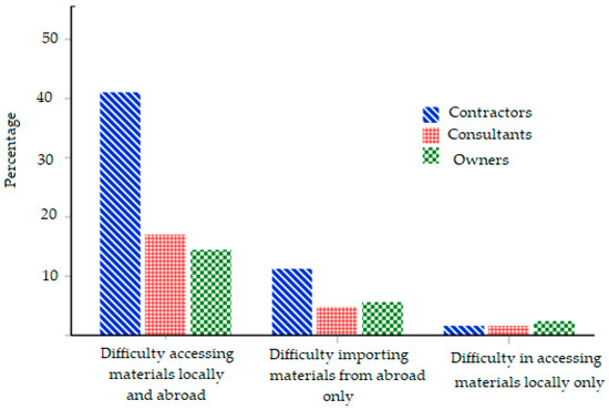 The pandemic affected every part of the supply chain, from manufacturing to customs and the inspection of imported materials in the country of origin, to shipping. As soon as the first lockdown was reported in China, where most of the systems and raw materials used in building originate, problems with shipping, clearing customs, and driving also occurred [44,45]. Construction researchers found that one of the primary causes of construction project delays in different countries has been identified as material delivery delays and delays in the shipping process [9,11,39,46,47]. The difficulties in purchasing materials and systems from the local or international market were of the highest rank, as seen in Table 5 and Figure 7, where the mean purchasing impact factor was 4.669. The material shortage was 3.952, and all ongoing projects during the time of lockdown suffered from the above consequences. The material shortages and availability of materials, as well as system problems, were associated with a lack of funds and cash flows to secure the stability of the supply chain process. It was found that the impact of the supply chain had the same features for large and small size contactors as well as consulting firms, as shown in Figure 12. Developing a supply chain emergency strategy that involves the identification of backup suppliers and the formation of collaborations among logistical specialists in order to face supply chain interruption was difficult because the limits imposed by COVID-19 increased the likelihood of supply chain interruption, creating extra difficulties for firms [31,38,40,41]. Therefore, importing material has become more difficult during the pandemic, and this called for considering other feasible alternatives in order to continue construction operations.