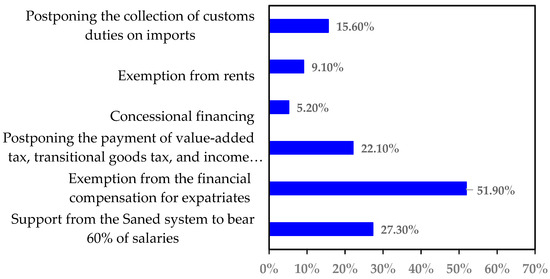 The participants suggested that losing employees is not in the firms’ best interests. A group of the respondents confirmed that the government’s action in the present circumstances is essential. Small and medium-sized firms have fewer financial resources available compared to large firms, which can often continue for a longer period [39,40,41,42,43]. In addition to receiving an assistance package, it is crucial for construction businesses to enhance the stability of labor productivity, remove fears and disturbance, and expeditiously handle any outstanding payments such as salaries, in order to maintain their operations and pay their staff.