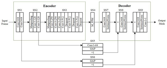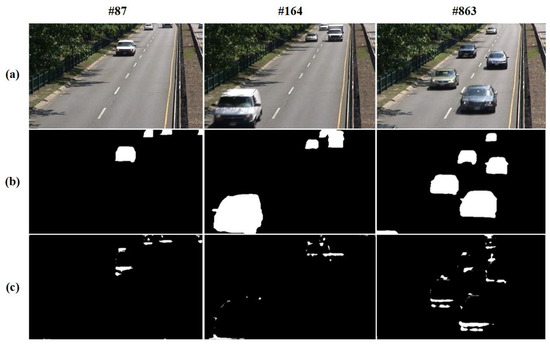 Vehicle detection is an important issue in intelligent transportation, and methods based on deep learning have become a research focus in this field [46]; one category of methods is based on deep learning-based foreground segmentation [47,48]. This experiment is conducted based on a foreground segmentation network [49]. The network consists of an encoder, a Feature Pooling Module (FPM), and a decoder. Two skip-connection modules are used between the encoder and decoder to merge low-level and high-level features, thereby improving detection performance. We trained this model using a portion of frames from the “highway” video in the CDnet2014 dataset [50] along with their annotations, making it a vehicle detection network, as shown in Figure 2. The training process strictly followed the experimental settings in Section 2 of [49]. And the used training code is from https://github.com/lim-anggun/FgSegNet_v2 (accessed on 10 August 2023). Figure 3a displays three video frames from “highway” that were not used for training, while Figure 3b shows the inference results of the trained model on these three video frames. It can be observed that the model performs well in detecting vehicles in different scenarios of the same scene. All vehicles are segmented, and their contours are fairly accurate. However, if the model encounters a tampering attack, the detection results can change significantly. Figure 3c shows the inference results of injecting Gaussian noise into the skip connection module SN5’s convolutional kernels. It can be seen that all detection results become unrecognizable. In real-life scenarios, computer vision companies develop deep models for vehicle detection and provide detection services to users, such as traffic management departments, through a model service system. Vehicle detection must be reliable, and if the model is subjected to the tampering attacks mentioned above during the service, it could lead to severe incidents. Sustainable model services are crucial to ensuring reliable vehicle detection.
