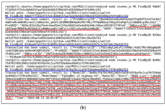 The model inference produces the vehicle detection results, and this step also considers the security of both the model and the detection results. Once the permission granting was successful, User1 input the and into the ModelInference() method of the smart contract MC and User2 input the and into ModelInference(). The automatic model inference process began. In our experiment, considering the model security, the inference of sub-networks took place in two off-chain servers. Sub-network SN1 started the inference, followed by SN2 and SN6. Next were SN3 and SN5, then SN4, SN7, SN8, and finally SN9. and the outputs from each sub-network were sequentially uploaded to the IPFS, see Figure 8a. The is a frame from the “highway” video named “highway_in000019.jpg”. The CIDs of the model input and sub-network inference outputs were encrypted and then uploaded to the blockchain as parts of the record of the model inference result. Figure 8b displays the records of the model outputs in the blockchain by invoking the FindByID() method, as indicated by a blue underline. The , marked with a red underline, is a dictionary containing the mapping of encrypted CIDs between each sub-network and its inference result. We have printed them all for reference.