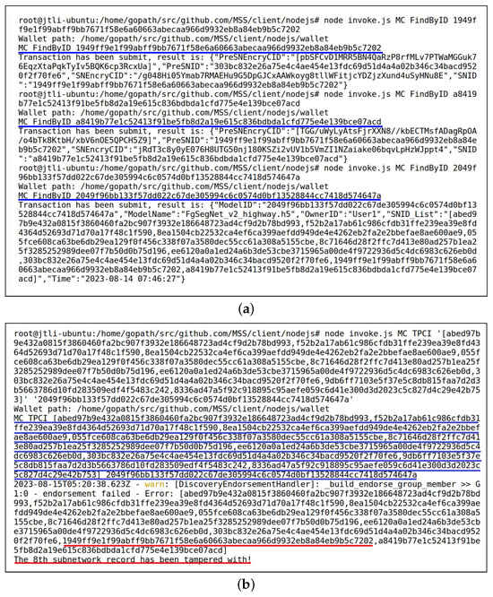 (a) Invoking to retrieve the tampered records of the vehicle detection model and its sub-networks SN8, SN3 in the blockchain. (b) Invoking to check the record of the tampered vehicle detection model in the blockchain.