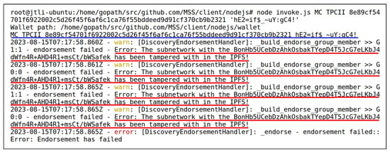 Although the model has been stored in both the blockchain and the IPFS, its security is not absolute, and there is a possibility of model tampering due to security vulnerabilities. To ensure the reliability of detection, it is essential to ensure the correctness of the vehicle detection model. This requires a tamper-proof checking method to dynamically and continuously monitor the correctness of the model. For the model tamper-proof checking, we demonstrate the results under two scenarios. The first scenario involves the tampering of model information in the blockchain. Instead of directly tampering with the model information in the blockchain, we uploaded a tampered sub-network record to the blockchain. Based on the design of the sub-network record and model record structures, the of subsequent sub-network records changed as a result, leading to changes in the model record. Therefore, we also uploaded the subsequent sub-network records and the corresponding model record to the blockchain. Specifically, for the sub-network SN8, we removed the encrypted CID of SN5 from its . As a result, in Figure 5a, the of SN8’s record has changed compared to Figure 4b, causing a change in its . The subsequent record after SN8’s record, which is the record of SN3, also experienced changes. Ultimately, the model record has changed as well. We utilized the AddModel() method from the smart contract MC to upload the tampered sub-network and model records to the blockchain, and then utilized the FindByID() method from MC to display these records, as indicated by blue underlines. By inputting the and the of the tampered model record, we conducted tamper-proof checking on the model using the TPCI() method in MC, as indicated by blue underlines. The results are shown in Figure 5b. It can be observed that the of the first tampered sub-network record, which corresponds to the record of SN8 marked with a red underline, has been detected during the checking and indicated as an error, as highlighted by a red underline. The second scenario involves tampering with the information stored in the IPFS. We deleted a file belonging to one of the sub-networks in the IPFS. Specifically, the file of SN5 was deleted. By inputting the original model record’s and the CID encryption key , as indicated by a blue underline, we conducted tamper-proof checking on the model using the TPCII() method in the smart contract MC. The results are shown in Figure 6. It is evident that the CID associated with SN5 cannot be retrieved, resulting in errors highlighted by red underlines.